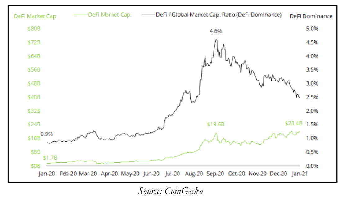 加密领域见证了2020年DeFi的迅速崛起,特别是在6月至8月。DeFi协议的市值在夏季的高峰期翻了12倍,达到196亿美元,现在被称为DeFi夏季2020。DeFi的主导地位,通过DeFi项目的市值除以总的加密货币市值来计算,从0.9%迅速上升到4.6%。