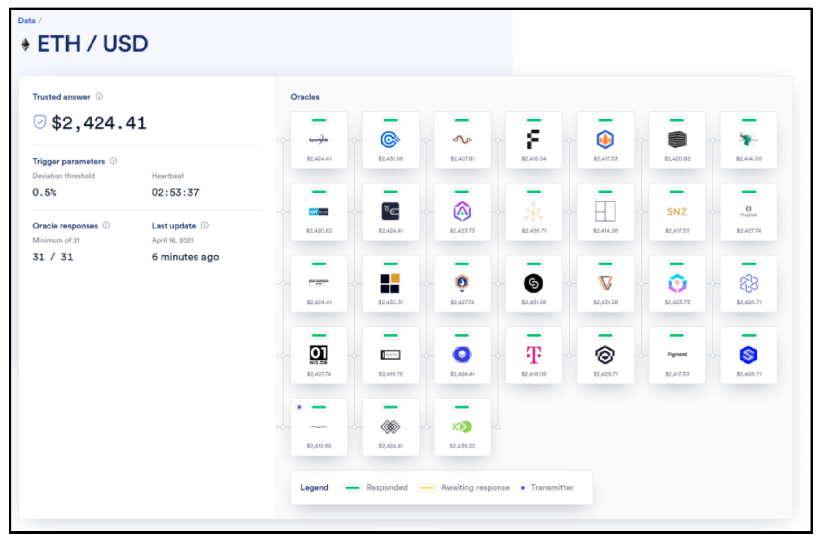 任何人都可以成为Chainlink节点运营商并开始向网络提供数据。 Chainlink的Price Feed网络由传统企业(如Deutsche Telekom 的T-systems、数据提供商和专业DevOps公司)共同运营的节点提供保护。运营自己的Chainlink节点的数据提供商直接在源头对他们的数据进行加密签名,为智能合约提供更高的安全保证。