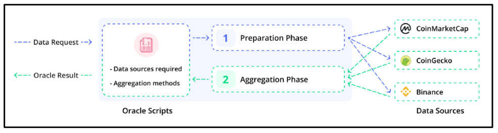 要从Band协议中检索数据,请求者需要指定几个参数:请求者想要调用的预言机脚本ID、预言机脚本的参数以及所需的验证器数量。一旦请求被提出并在BandChain上被验证,预言机脚本通过发出满足请求所需的数据源,开始执行被称为准备阶段的第一阶段。