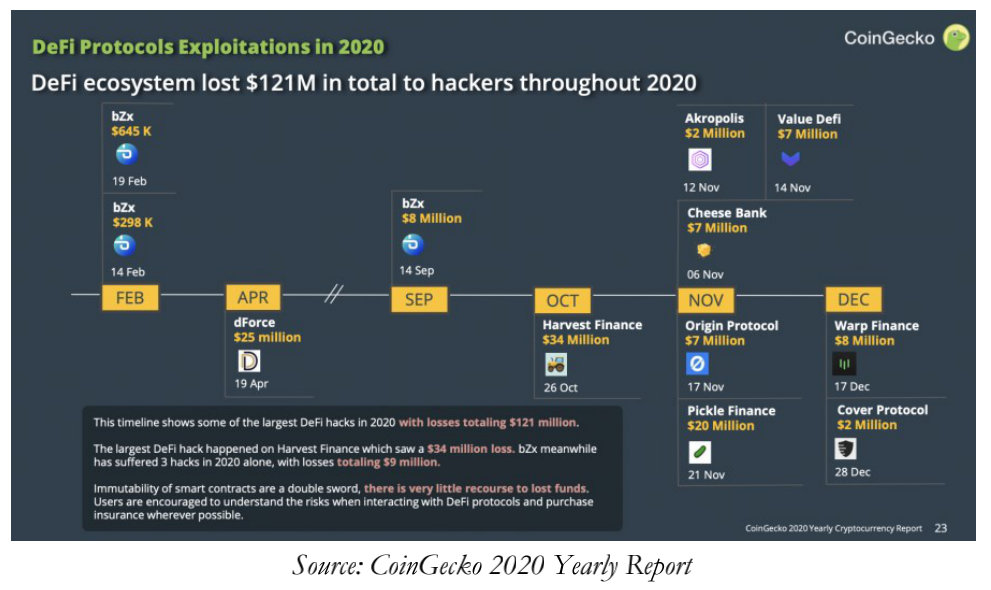 探索DeFi是有风险的,智能合约被黑客攻击一直在发生。仅在2020年,就有至少12次高调的DeFi黑客攻击,从DeFi协议中盗走了不少于1.21亿美元的资金。