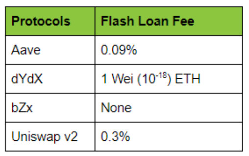 下表显示了提供闪电贷的主要协议所收取的费用: