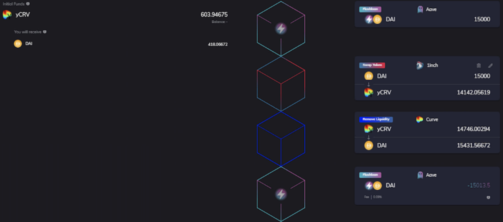 偿还包括闪电贷费用在内的15,013DAI给Aave。用户剩下的利润是418DAI。所有这些步骤都在一次交易中执行完成。