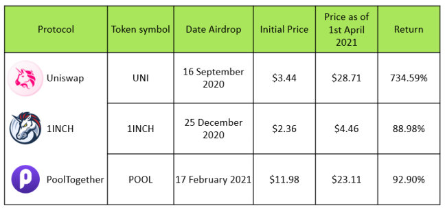 最引人注目的空投之一是由Uniswap进行的空投。截至2021年4月1日,空投的价值(400个UNI)高达11,484美元。(题外话:如果你在2020年阅读了我们的《如何DeFi:初学者》一书,并在空投前使用了Uniswap,你也会收到UNI代币空投!)