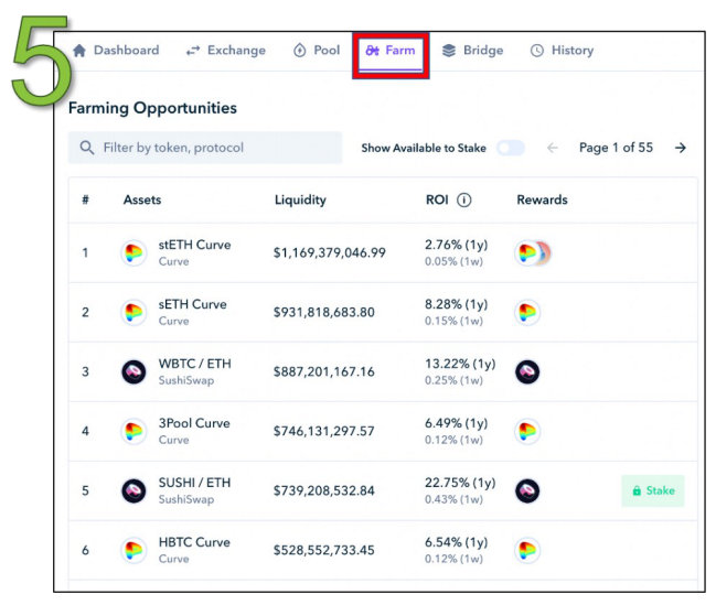 点击页面上方的"Farm"选项卡,会列出了收益耕作机会和它们各自的预期收益