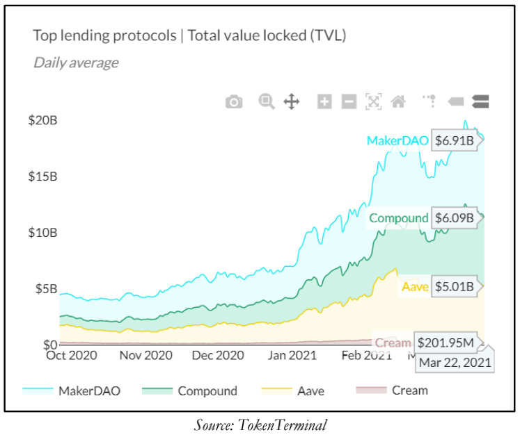 领先的DeFi借贷协议是Compound、Maker、Aave和Cream。