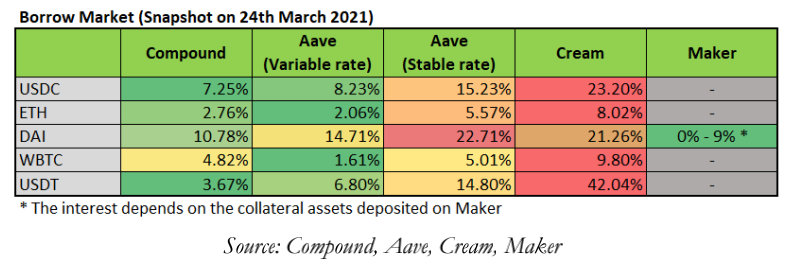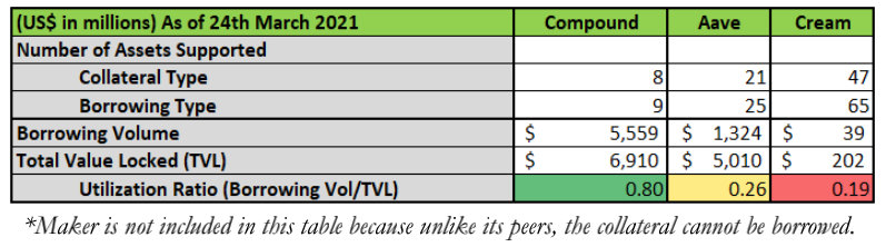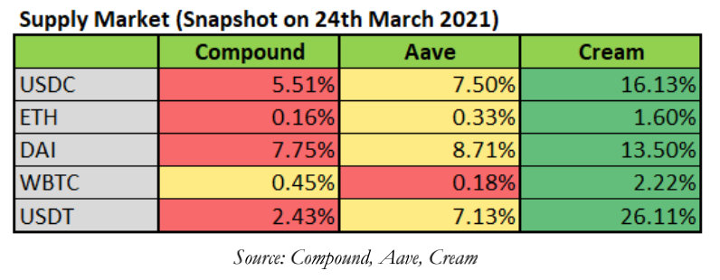 根据上表,Cream提供最高的APY,Compound提供大多数资产的最低APY。作为一个贷款人,虽然在Cream上赚取最高的APY似乎是最理想的,但相对于其同行,高APY往往意味着在这些贷款协议中存入资金的潜在风险更高。