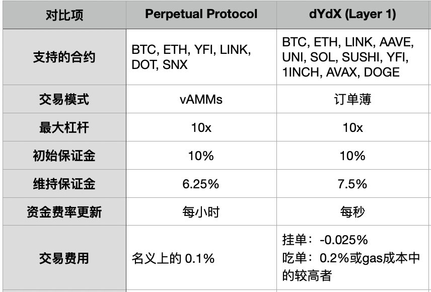 就合约规格而言,两个平台为各自的市场提供了高度相似的杠杆选项和保证金要求。Perpetual Protocol提供的资产种类更多,对未结头寸的资金利率宽容得多,目前有平均6000万美元的日交易量,而2021年第一季度dYdX在Layer 1上完成了1500万美元交易量。另一方面,dYdX采取了"指数"方法,不断使其持仓者受益,但是其较高的交易费用可能使小型交易者望而却步。