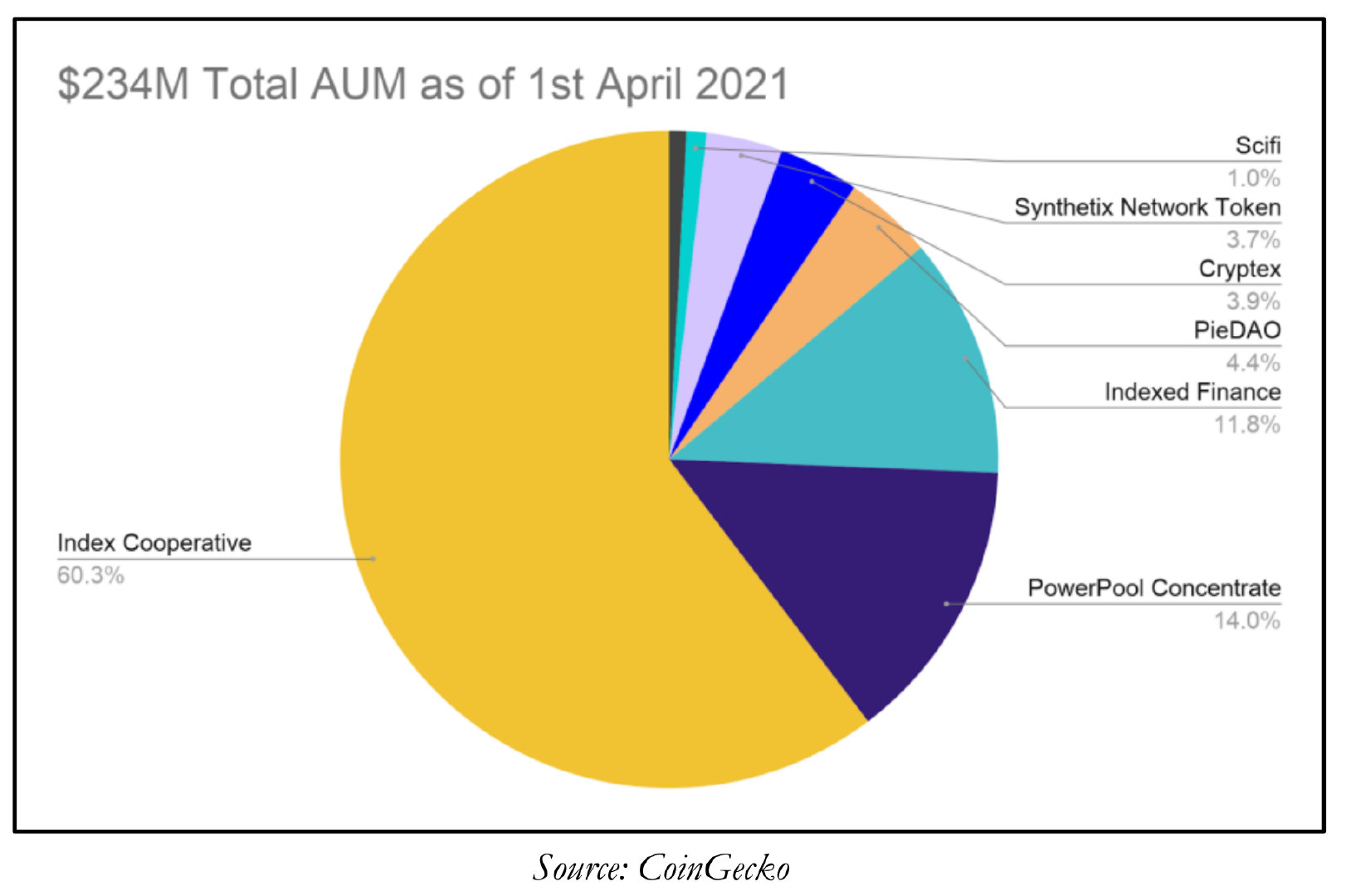 截至2021年4月1日,指数合作公司(Index Cooperation)拥有最大的市场份额,占去中心化指数AUM的60%。其次是PowerPool(14%)和Indexed Finance(12%)。