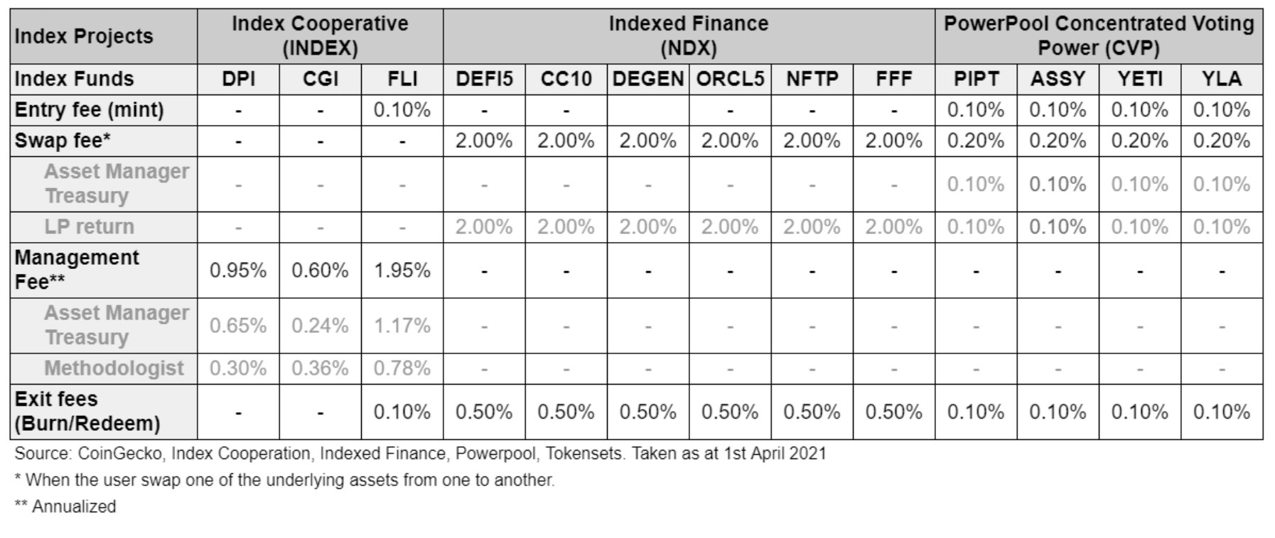 每个指数的管理费由Index Coop和相关的方法学家分成。费用如下 - DPI:0.95%,CGI:0.60%,FLI:1.95%。DPI和CGI没有退出费。只有FLI有0.1%的退出费。