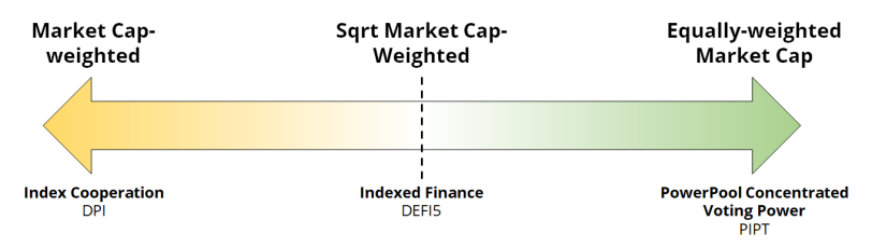 II. 市值平方根加权(例如:DEFI5) Indexed Finance上的所有指数都基于相对于每个代币市值的平方根。这种方法减弱了市场表现向较大市值代币倾斜的影响。